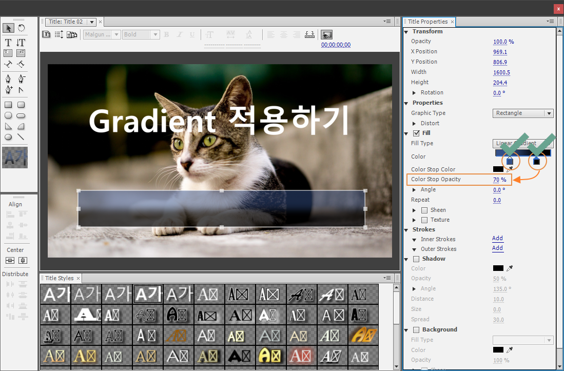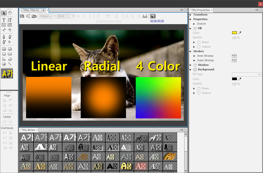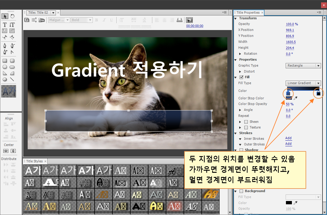 프리미어의 Titler(타이틀러/자막기능)에서 상당히 다양한 기능을 제공하고 있으며 그중 그라데이션 효과를 이용하면 좀 더 다양한 모습의 자막을 만들 수 있습니다.