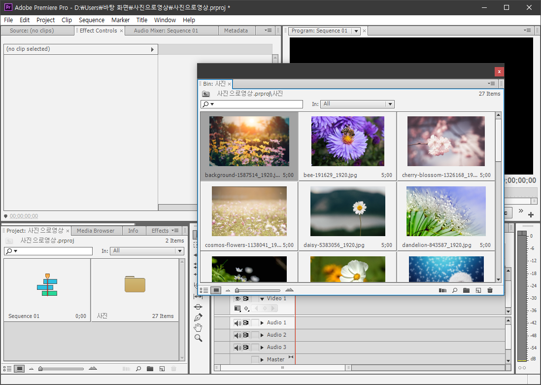 5. 프로젝트 패널에 '사진' 폴더(Bin) 만들기