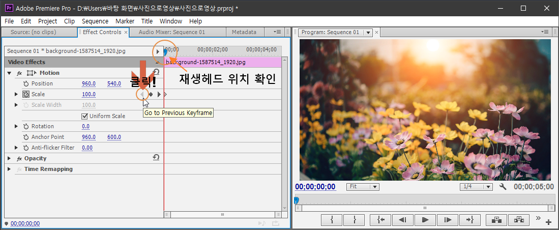 타임라인의 사진을 클릭해서 Effect Controls 패널이 활성화되면 Motion 항목을 열어주세요.