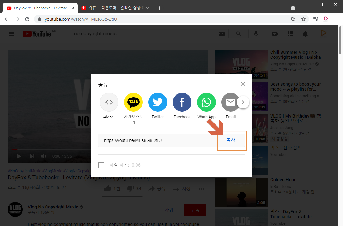 YouTube 영상의 [ 공유 ] 를 눌러서 주소를 복사합니다.