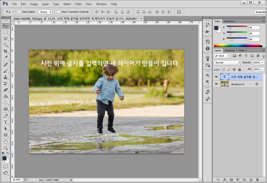 1번 레이어에 밑바탕이 되는 사진 한장을 놓고 글자를 적으면 새로운 레이어가 자동으로 만들어지면서 글자가 입력됩니다. 글자와 사진을 합칠 수도 있으나 수정을 위해 합치는 방법은 그리 권장하지 않습니다.