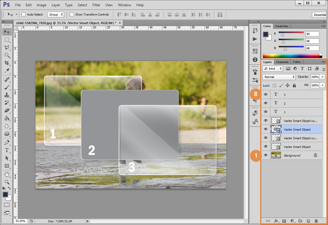 6번~8번 레이어에 숫자 1, 2, 3이란 글자가 들어가 있습니다.