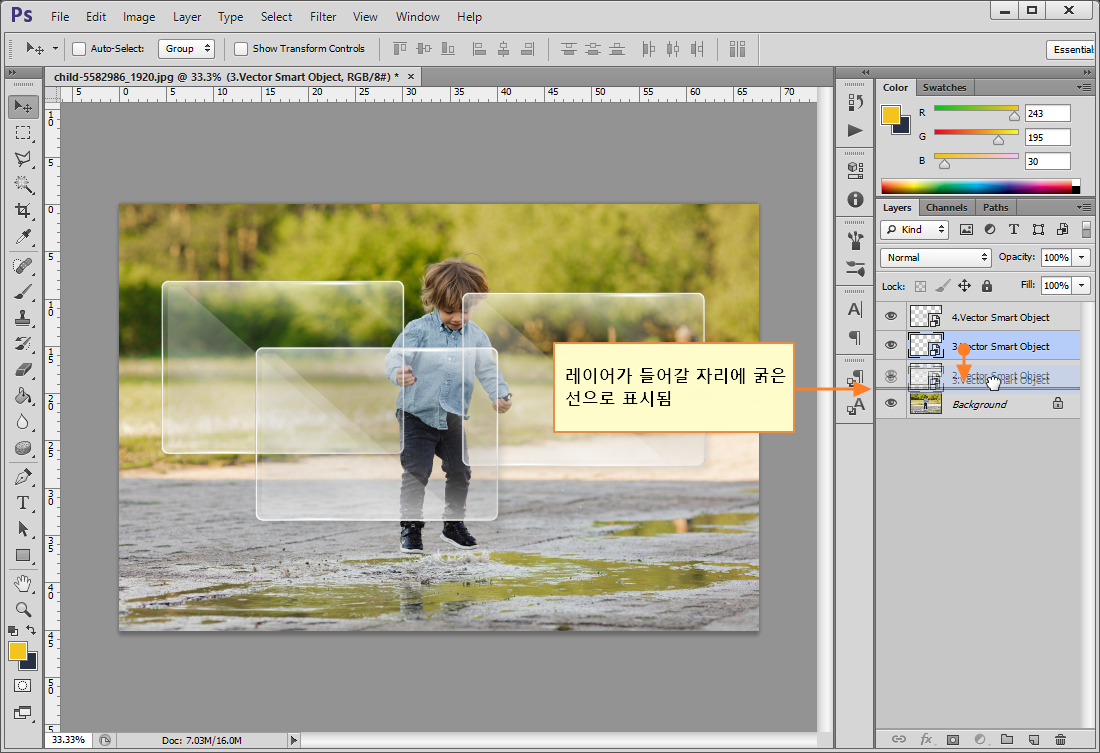 레이어 패널에서 이동대상 레이어를 클릭한 상태에서 위 또는 아래로 움직이면 됩니다. 이때, 이동하려는 레이어가 들어갈 자리에 굵은 선이 표시되어 이동할 위치를 확인할 수 있습니다.