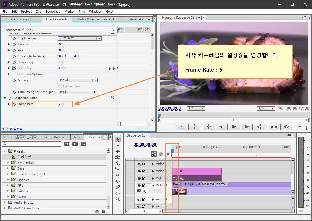 Effects (이펙트/효과) 패널의 검색창에 'time'라고 입력한 후 검색된 결과 중 'Posterize Time(포스터라이즈 타임)' 를 찾아서 Video 2 트랙에 올린 타이틀에 적용해 줍니다.