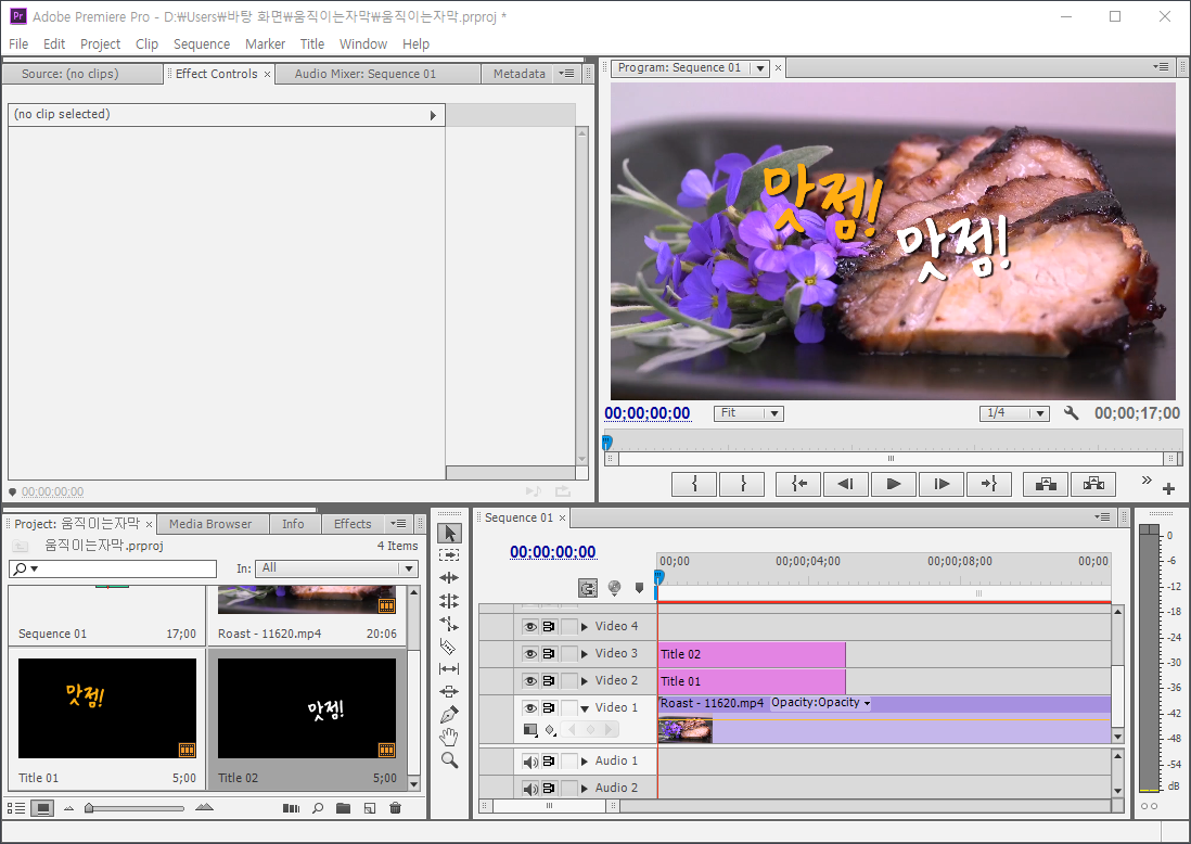 아래와 같이 타이틀을 Video 2, 3 트랙에 올려줍니다.