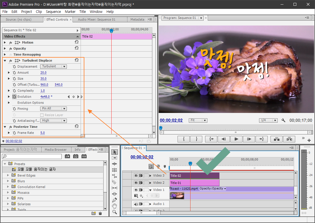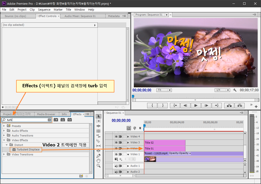 Effects (이펙트/효과) 패널의 검색창에 'turb'라고 입력한 후 검색된 결과 중 'Turbulent Displace (터뷸런트 디스플레이스)' 를 찾아서 Video 2 트랙에 올린 타이틀에 적용해 줍니다.