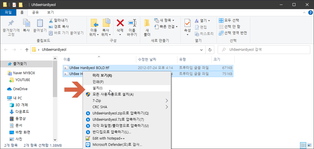 다운로드한 폰트 파일에서 마우스 우클릭 후 '설치' 선택