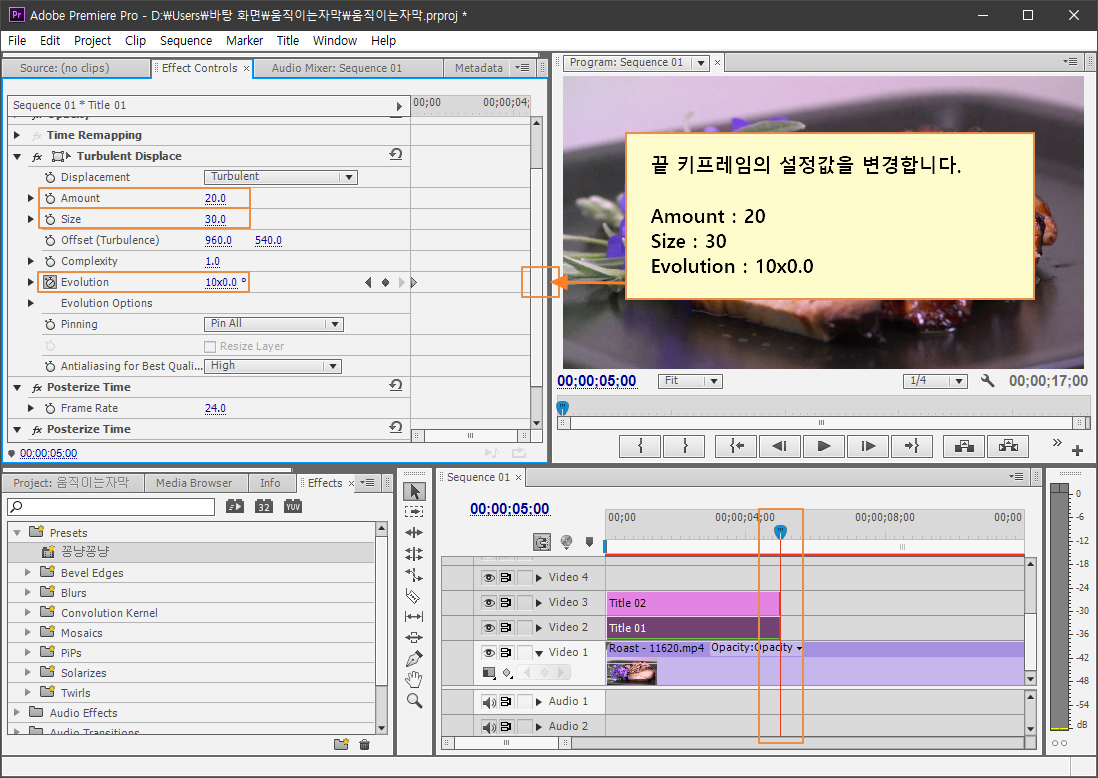 효과를 적용해 놓은 Video 2 트랙에 올려놓은 첫 번째 타이틀을 선택한 후 Effect Controls (이펙트 콘트롤/효과제어) 패널에서 Turbulent Displace (터뷸런트 디스플레이스) 항목 중 Evolution(에볼루션) 항목 앞의 스톱워치를 눌러 키프레임 하나를 찍어줍니다.