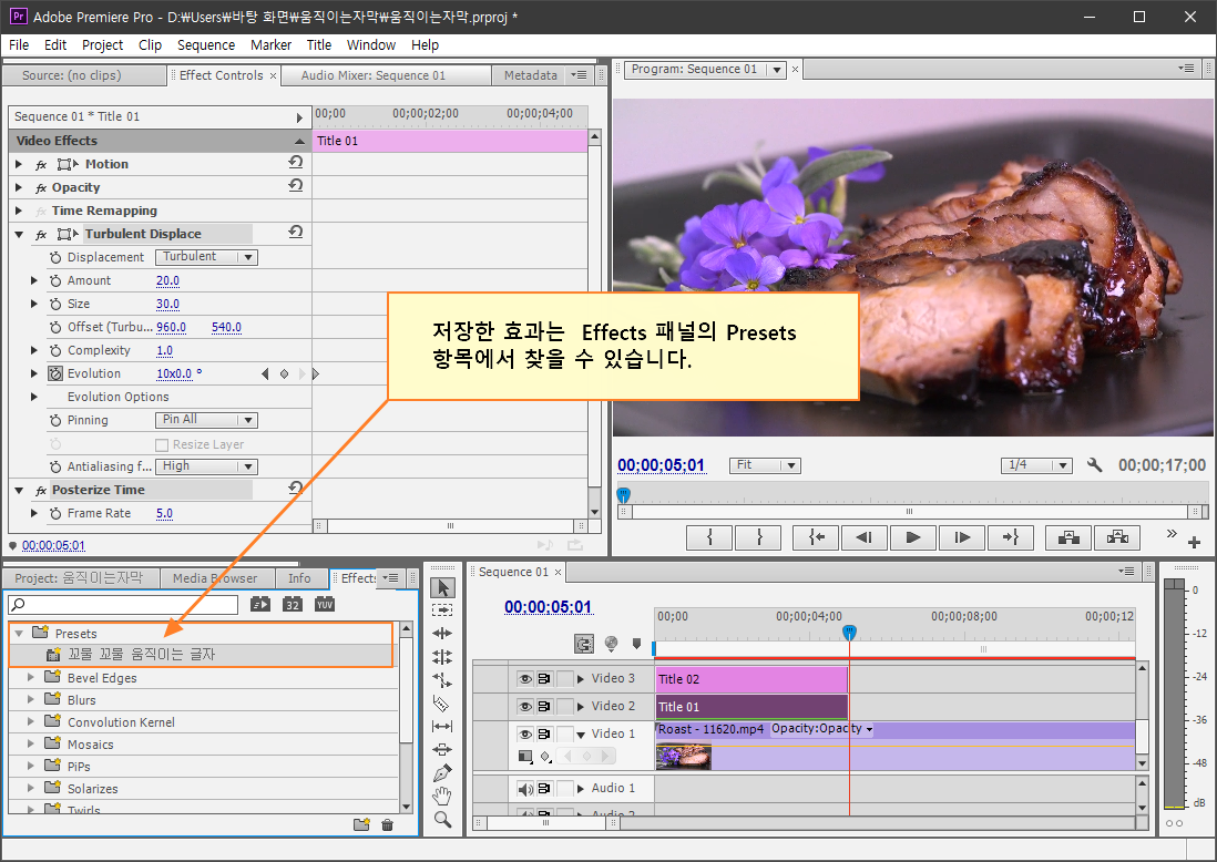 이제 두 번째 타이틀에 Presets 에 저장해 놓은 효과를 일반 효과 적용하듯이 드래그해서 적용하면 됩니다.
