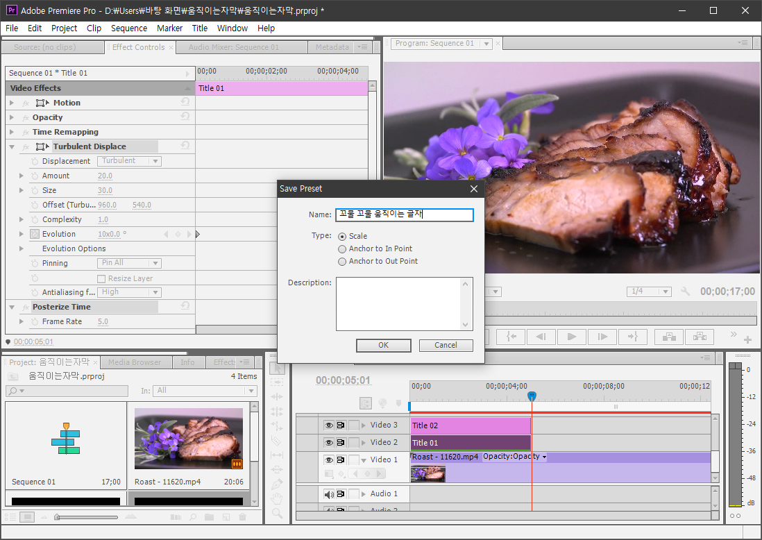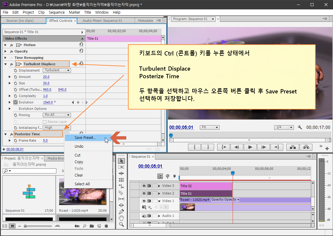 키보드의 Ctrl (콘트롤) 키를 누른 상태에서 Turbulent Displace 항목과 Posterize Time 항목을 같이 선택 후 오른쪽 마우스버튼 클릭하고 Save Preset 을 선택합니다.