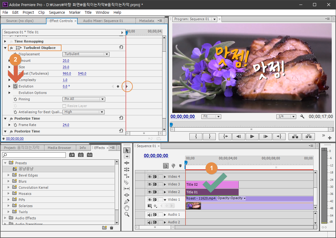 효과를 적용해 놓은 Video 2 트랙에 올려놓은 첫 번째 타이틀을 선택한 후 Effect Controls (이펙트 콘트롤/효과제어) 패널에서 Turbulent Displace (터뷸런트 디스플레이스) 항목 중 Evolution(에볼루션) 항목 앞의 스톱워치를 눌러 키프레임 하나를 찍어줍니다.