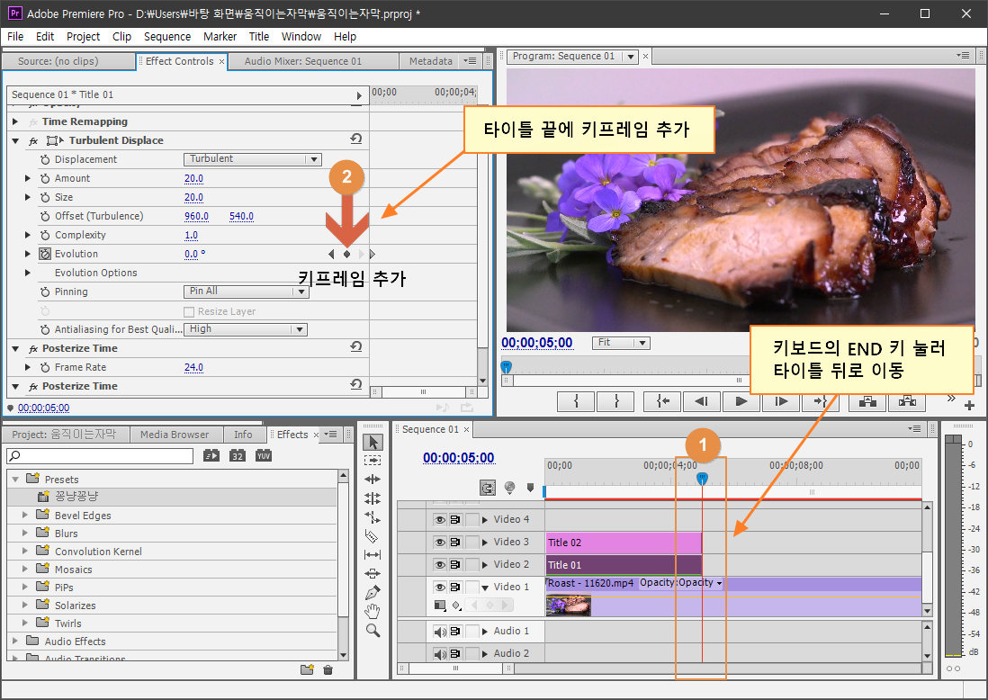 Effects (이펙트/효과) 패널의 검색창에 'turb'라고 입력한 후 검색된 결과 중 'Turbulent Displace (터뷸런트 디스플레이스)' 를 찾아서 Video 2 트랙에 올린 타이틀에 적용해 줍니다.