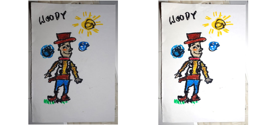 주변을 지우고 나니 흰색 종이지만 완전히 흰색으로 안 보이죠. 이유는 완벽한 보정이 이루어지지 않았고 종이에 닿는 빛의 양이 서로 달라서 그렇습니다. 해결 방법은, 넓은 조명을 사용해서 종이 위에 골고루 빛이 닿도록 하거나 촬영 후 부분적으로 좀 더 보정을 하면 됩니다.
