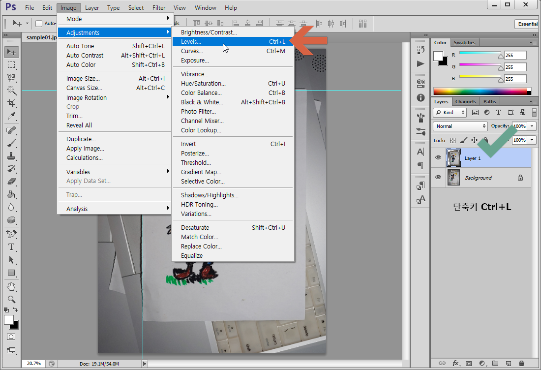 Image 메뉴 - Adjustments - Levels 선택 또는 단축키 Ctrl + J를 누릅니다.