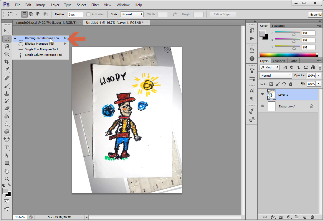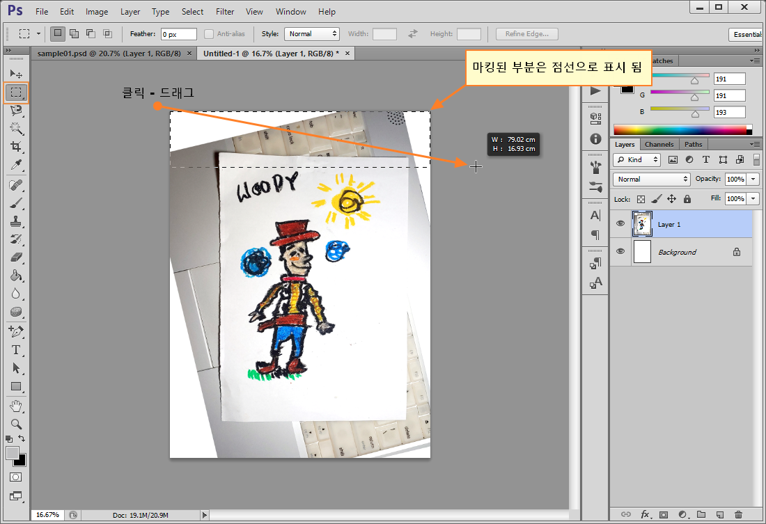 아래와 같이 도구 중 Rectangular Marquee Tool (렉트 앵글러 마크 툴 / 사각형 마크 도구)
