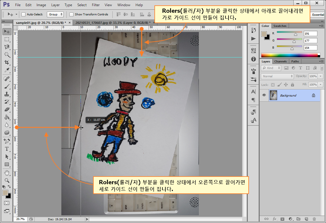 만약 자 (Rulers) 부분이 보이지 않는다면 Ctrl + R 키를 눌러보세요.
