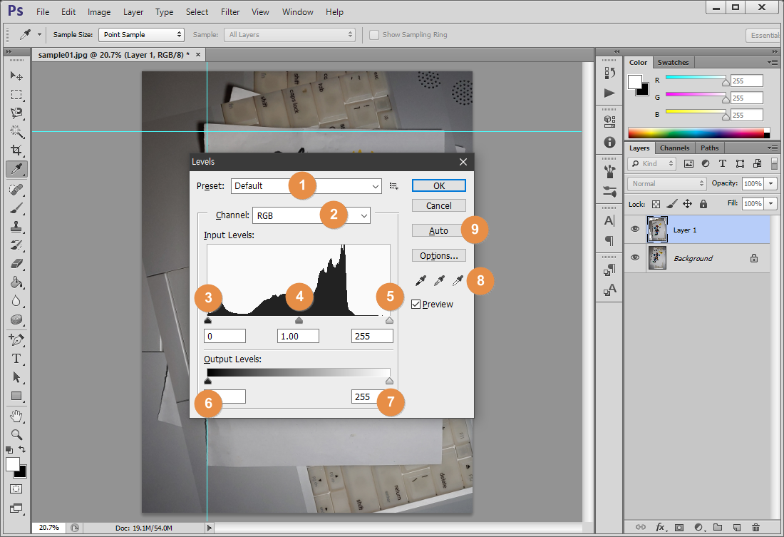⑧ 스포이트 사용 화이트 밸런스/노출 보정 (검은색, 회색, 흰색 부분 선택)
