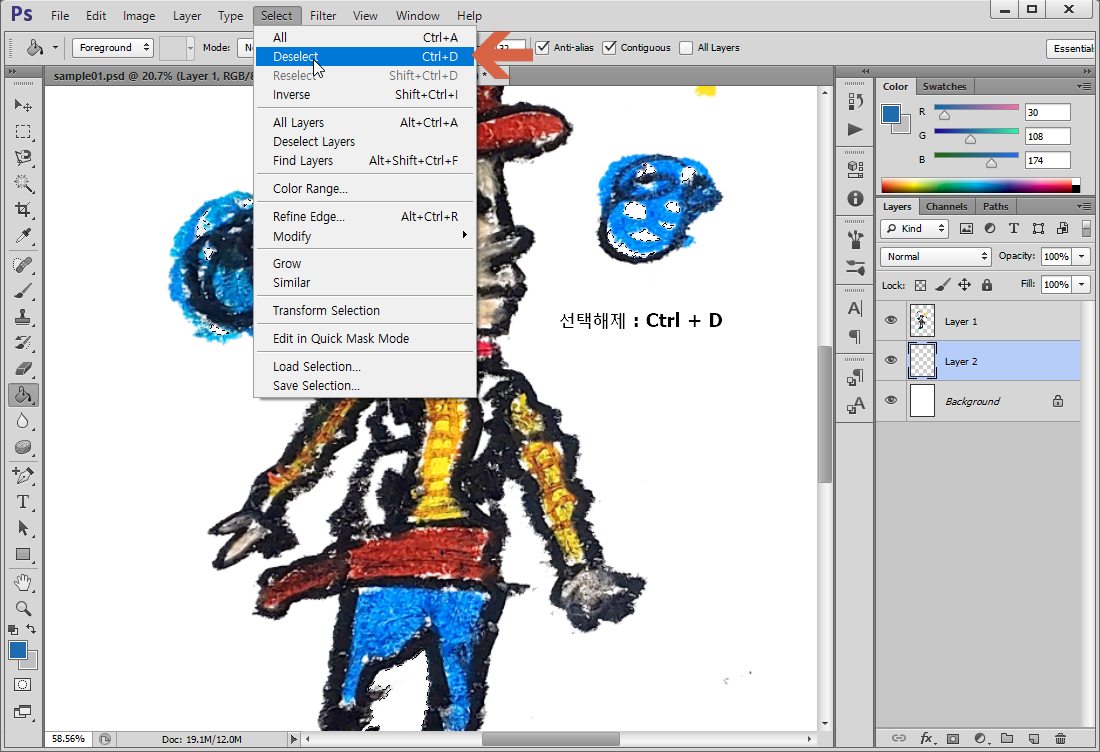 먼저, 마법 지팡이로 선택한 부분을 해제해야 됩니다. 해제하지 않으면 이후 작업에 지장을 받게 됩니다.