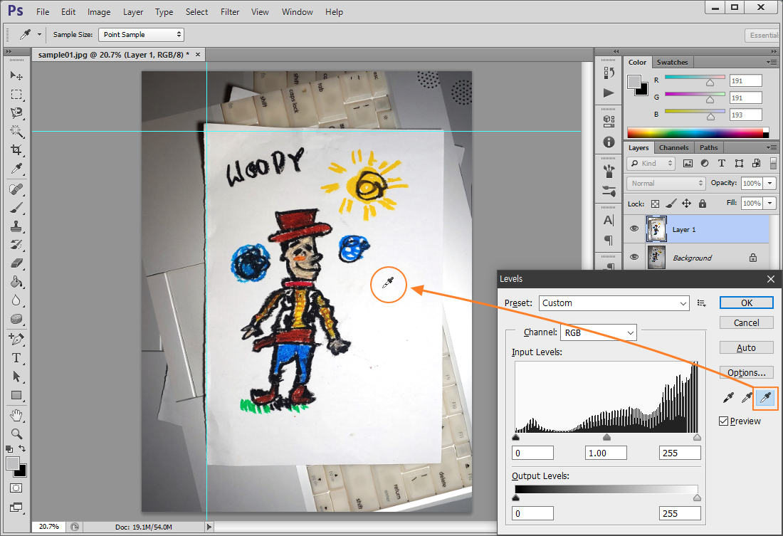아래와 같이 오른쪽 스포이드를 선택 후 흰색 종이를 클릭하면 자동으로 화이트 밸런스와 노출을 맞춰줍니다. 확실히 흰색 종이가 조금 전 보다 더 하얗게 보이며 그림이 잘 보이죠.