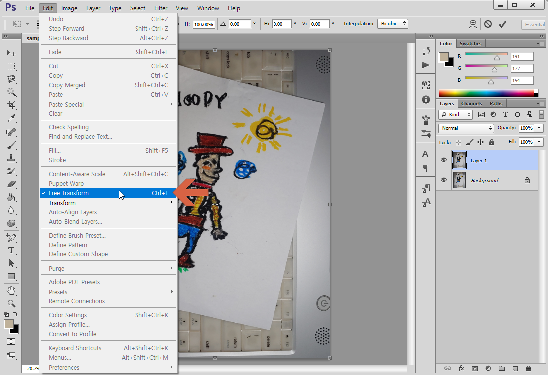 ② Edit 메뉴 - Free Transform 또는 단축키 Ctrl + T를 누릅니다.