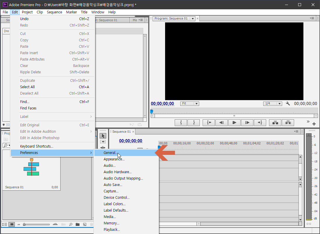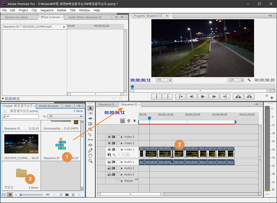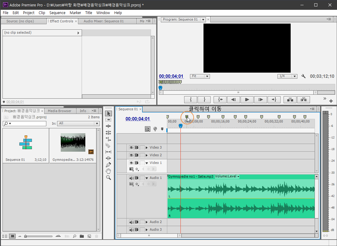 ① 배경음악을 프리미어의 프로젝트에 추가한 후 음악 소스만 타임라인에 올립니다.