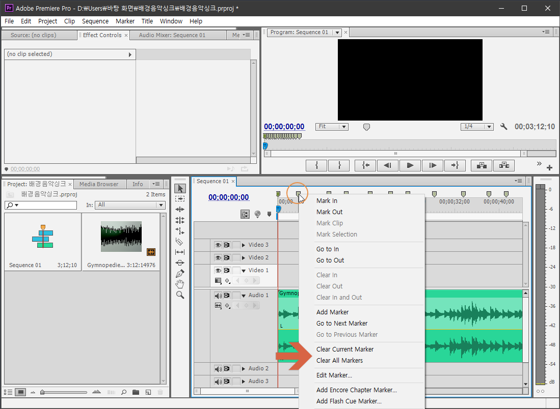 마커가 표시된 부분에서 마우스 우클릭한 후 옵션메뉴에서 Clear Current Marker(현재 마커 지우기) 또는 Clear All Makers(전체 마커 지우기)를 선택하면 됩니다.