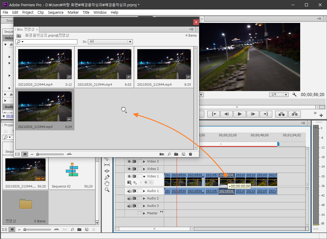 ④ 컷 편집된 타임라인에서 영상 클립을 클릭해서 새로 만든 폴더로 드래그하여 넣기