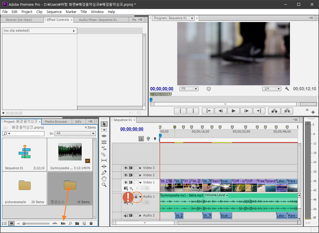 오디오가 포함되어 있는 영상 소스를 바로 올리면 배경음악을 지워버릴 수 있기 때문에 배경음악이 있는 오디오트랙을 먼저 잠가야 됩니다.