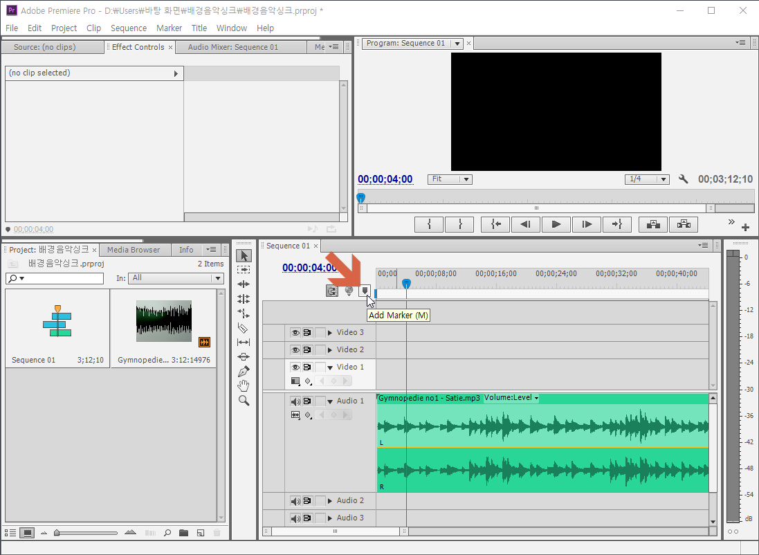 우리가 사용할 기능은 바로 타임라인 좌측 위쪽에 있는 Marker 라는 버튼입니다. 단축키가 M 이므로 음악 들으면서 박자에 맞춰 M 키를 눌러주면 됩니다.