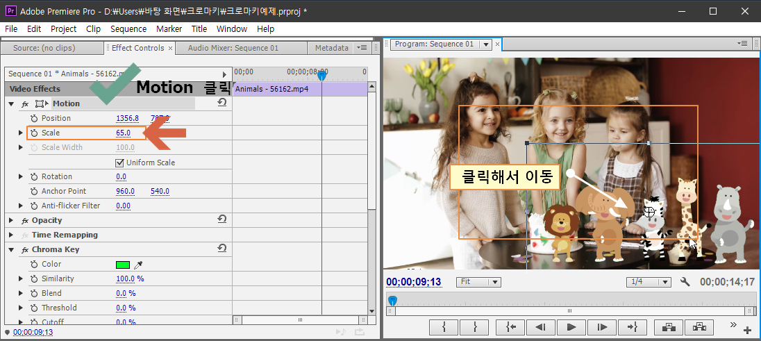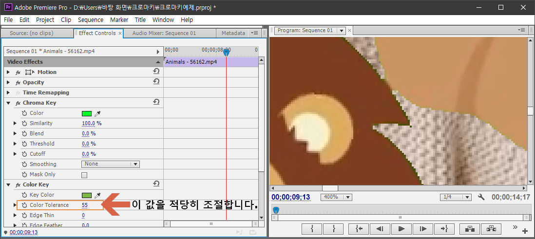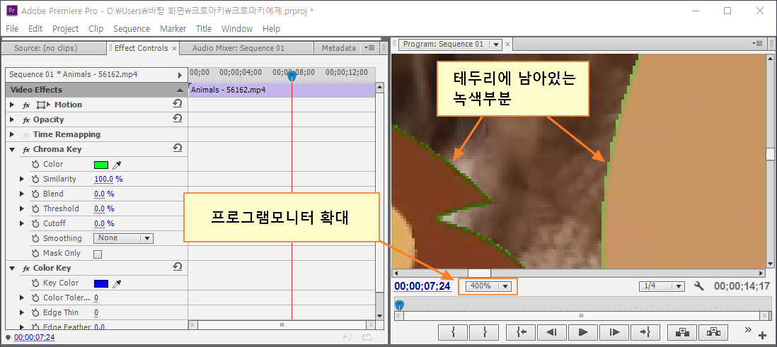 보통 Chroma Key 하나만 사용해도 되지만 Color Key를 함께 사용하니 좀 더 깔끔하게 처리되어서 두 개의 효과를 함께 적용하고 있는데요, 크로마키를 두 번 적용해서 처리해도 됩니다.