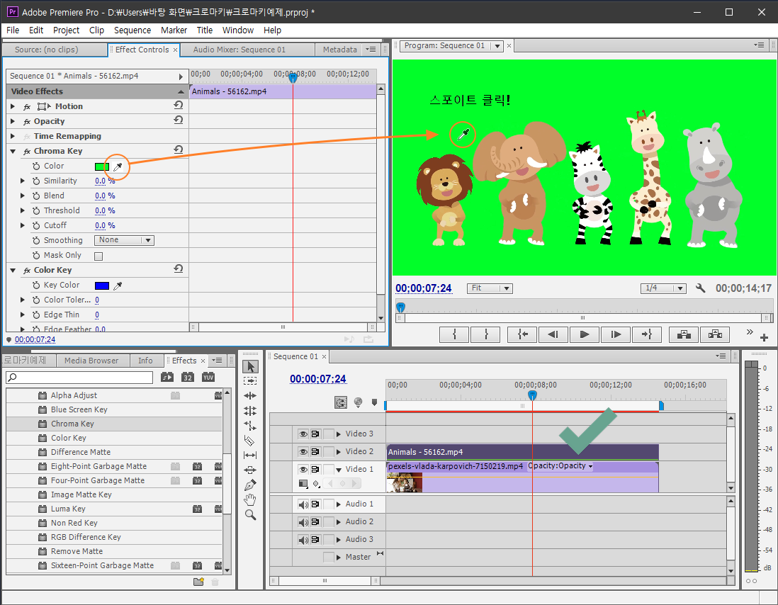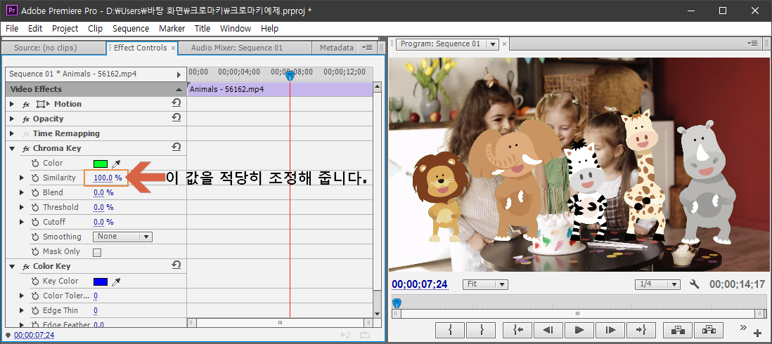 보통 Chroma Key 하나만 사용해도 되지만 Color Key를 함께 사용하니 좀 더 깔끔하게 처리되어서 두 개의 효과를 함께 적용하고 있는데요, 크로마키를 두 번 적용해서 처리해도 됩니다.