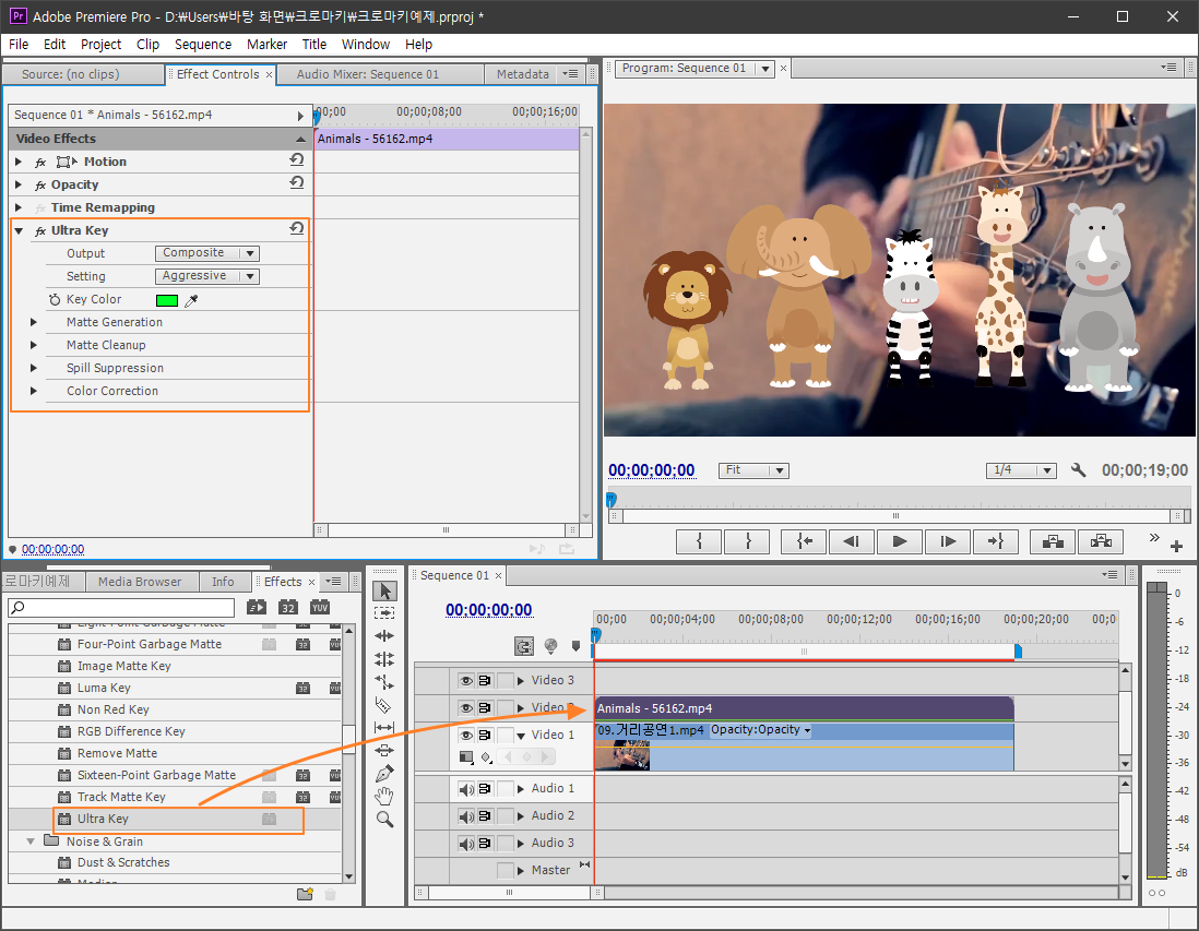 Video Effects - Keying - Chroma KeyColor Key 두 개의 효과를 Video 2 트랙에 올려놓은 영상에 적용해 줍니다.