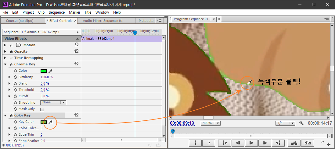 Effect Controls 패널에서 Chroma Key 항목에 있는 스포이트를 선택한 후 프로그램 모니터에서 녹색 부분을 클릭해 줍니다.