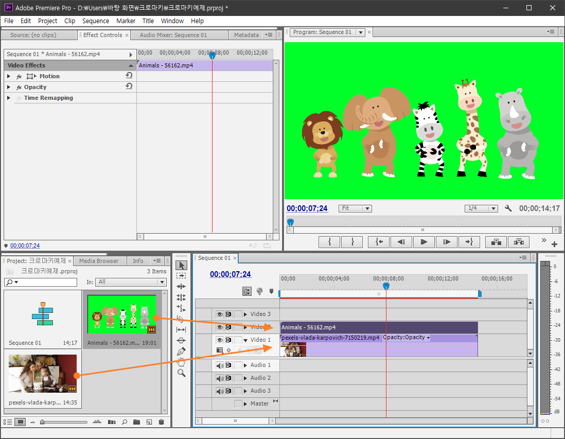아래 영상은 녹색 바탕의 동물 캐릭터 영상에 크로마 키칼라 키 두 개를 조합하여 배경에 합성한 샘플 영상이며, 그림자 효과는 덤입니다.