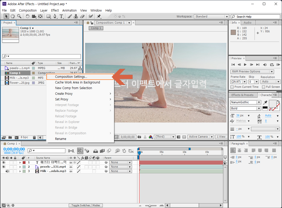 프로젝트 패널의 컴포지션 항목에서 마우스 우클릭하여 Composition Settings 를 선택합니다.