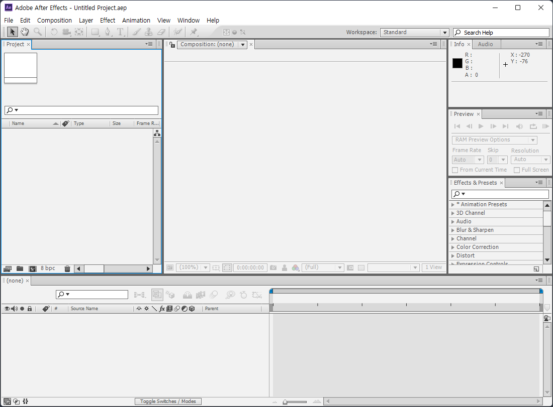에프터 이펙트는 프리미어와 달리 실행하면 자동으로 프로젝트가 만들어져 있는 상태입니다.