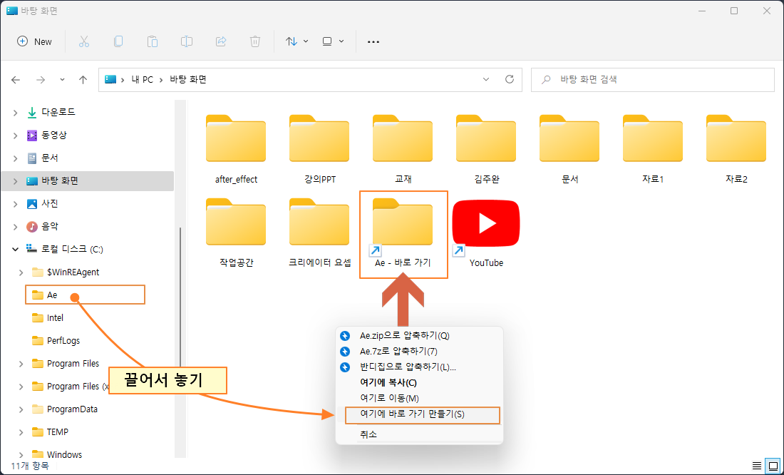 바탕화면에 'Ae' 폴더 바로가기 만들기