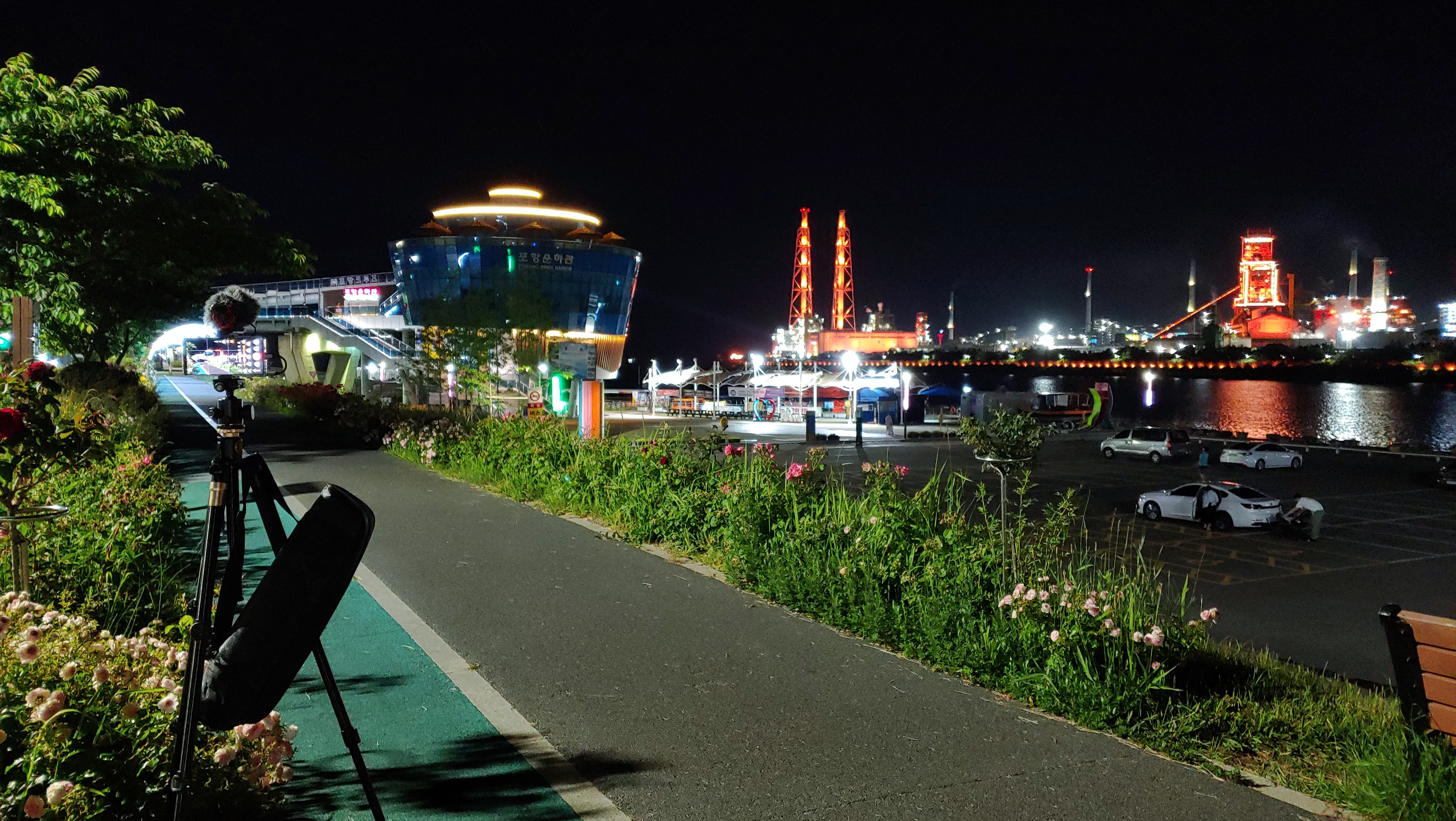 운하관 앞 형산강변길에서 삼각대 세워서 영상촬영 걸어놓고 저는 벤치에 앉아 딴청 중... 삼각대 옆에 서 있으면 사람들이 경계하기 때문에 촬영 중에는 잠시 떨어져 있습니다.