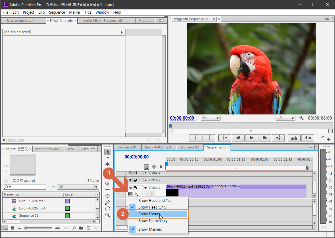 타임라인에서 ① 번 부분을 클릭한 후 ② Show Frames 선택
