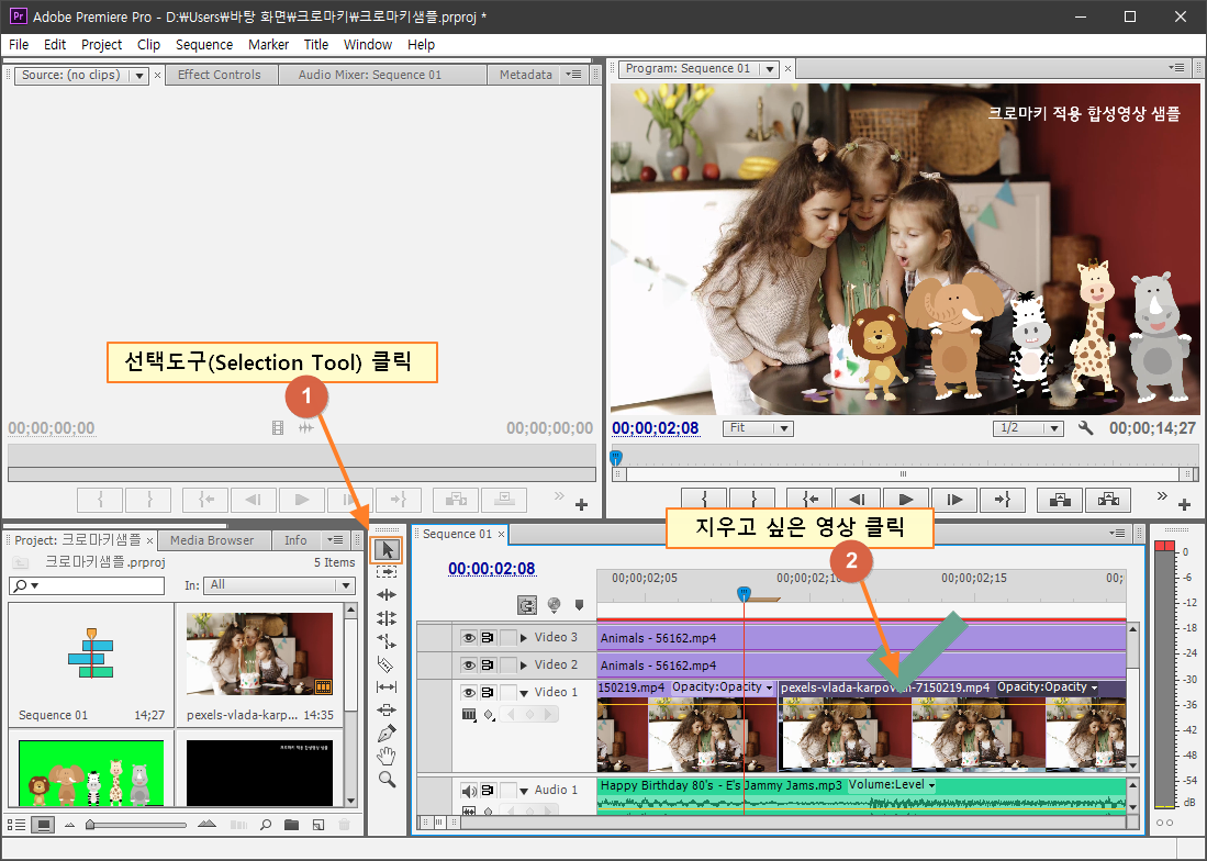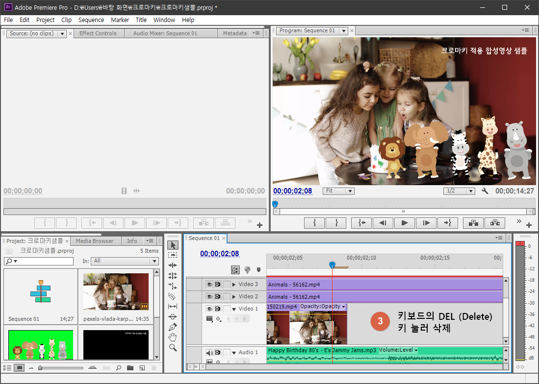 필름은 필요없는 부분을 잘라서 휴지통에 버리면 되지만 프리미어에서는 필름처럼 물질적인 형태가 아니므로 집어서 버리진 못하겠죠. 대신 컴퓨터의 기본 기능인 '삭제(Delete)'라는 기능을 사용해서 지우면 됩니다.