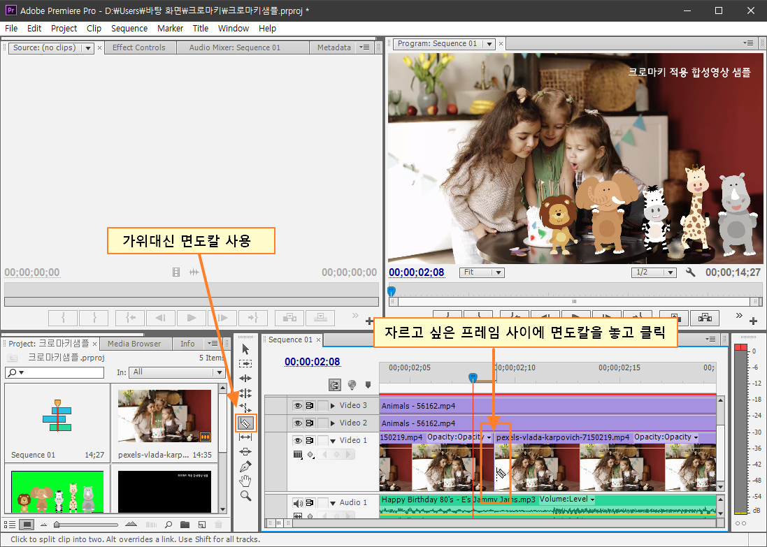 그다음 자르고 싶은 프레임 사이에 가위 대신 면도칼을 데고 클릭하면 잘립니다.