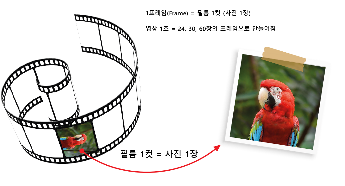 요즘은 거의 사용하지 않지만 일반적으로 필름 카메라로 사진을 찍으면 필름 한 컷이 한 장의 사진으로 만들어지죠. 영상에서는 이렇게 찍은 사진을 연속으로 보여주는 것이며 보통 1초에 24, 30, 60개의 사진을 연속으로 보여주는 것입니다.