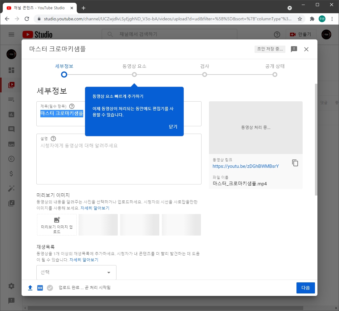 업로드가 진행되면 아래와 같이 화면이 바뀌며 제목에는 기본적으로 파일 이름이 자동으로 들어가 있습니다.