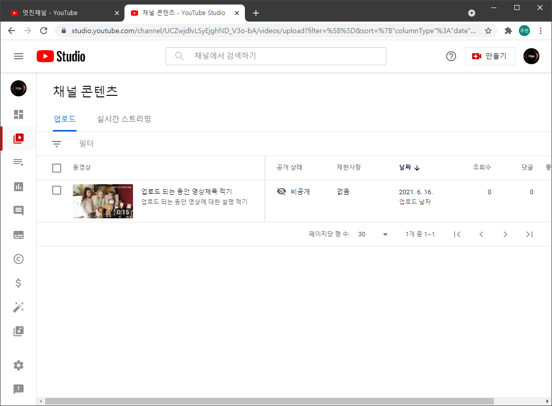 업로드가 완료되면 아래와 같이 채널 콘텐츠 페이지에서 목록으로 나오게 됩니다.
