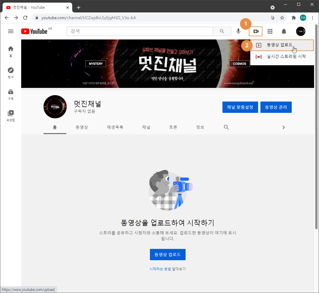 등록한 영상이 전혀 없을 경우 아래와 같이 채널 첫 페이지 하단에 [ 동영상 업로드 ]라는 버튼이 보이며 이 버튼을 누르면 영상을 업로드할 수 있습니다.