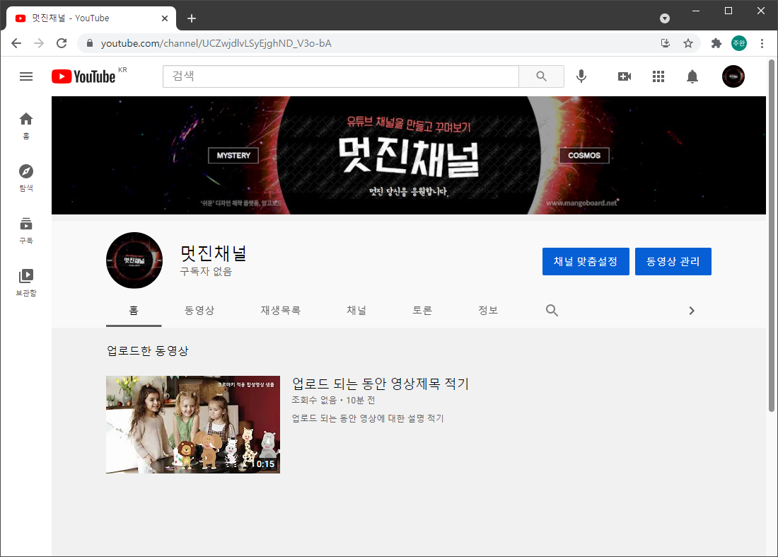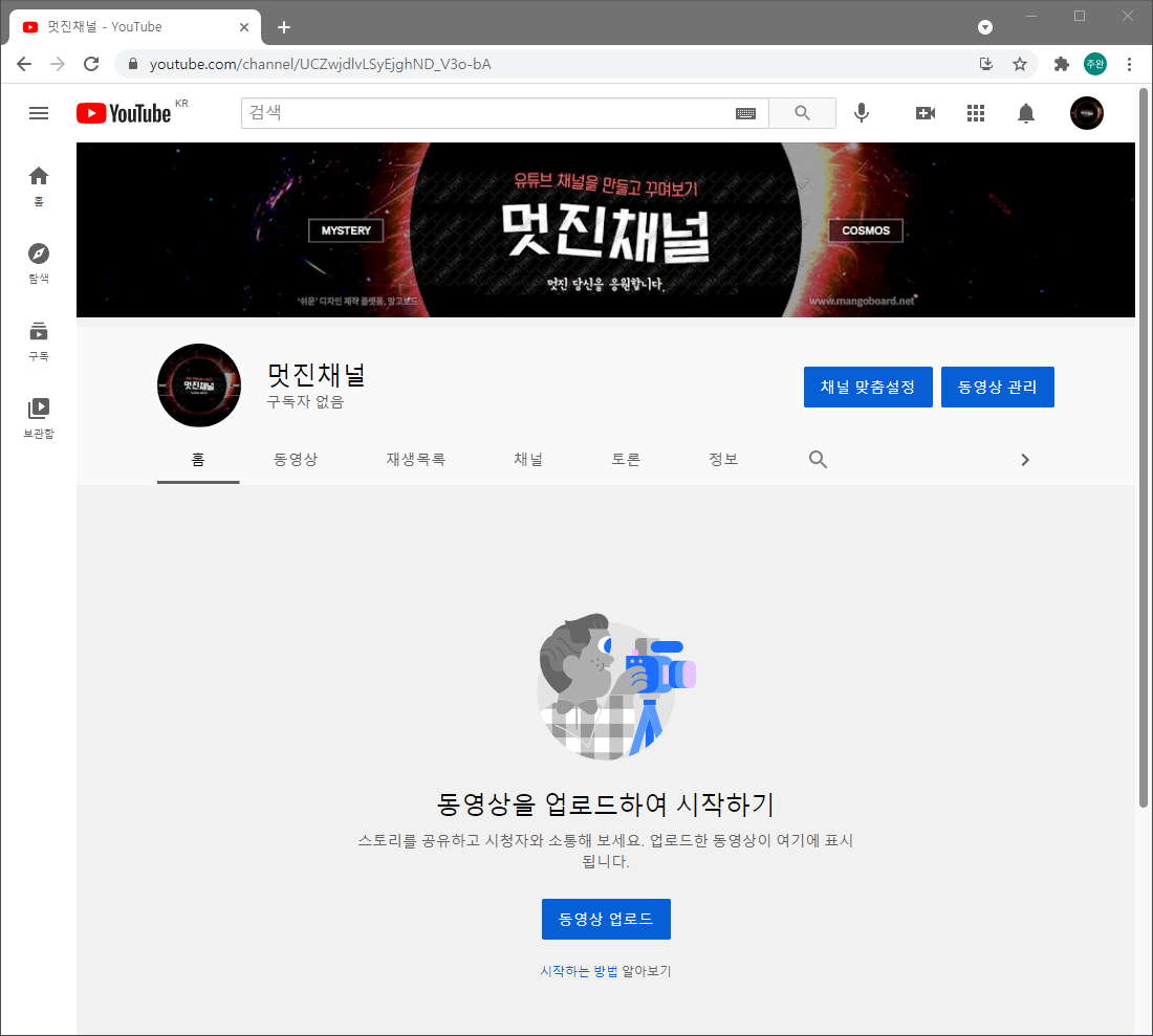 아래와 같이 아직은 텅 빈 나의 채널에 연결되었습니다.