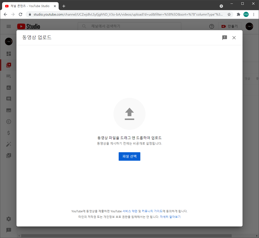 아래와 같이 '동영상 업로드' 창이 열립니다.