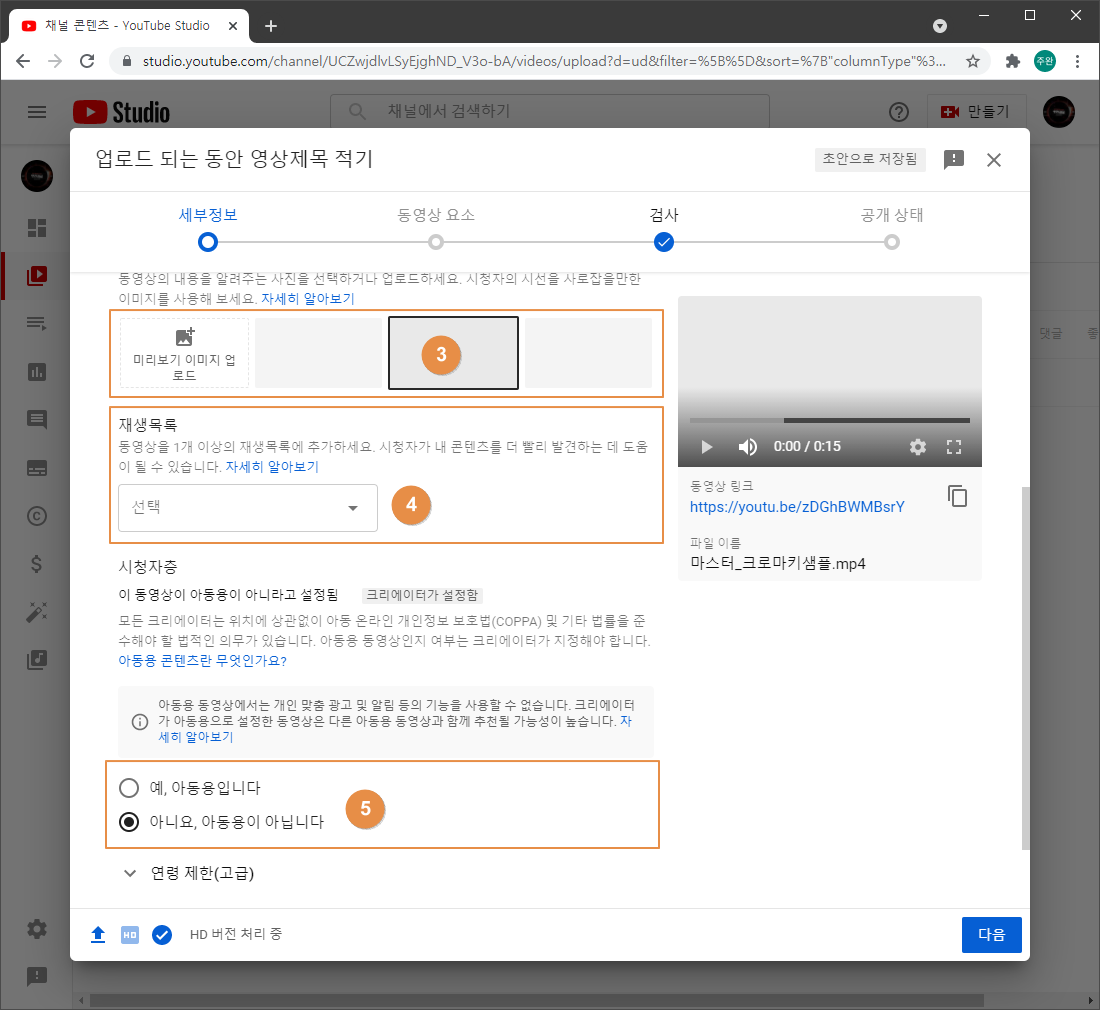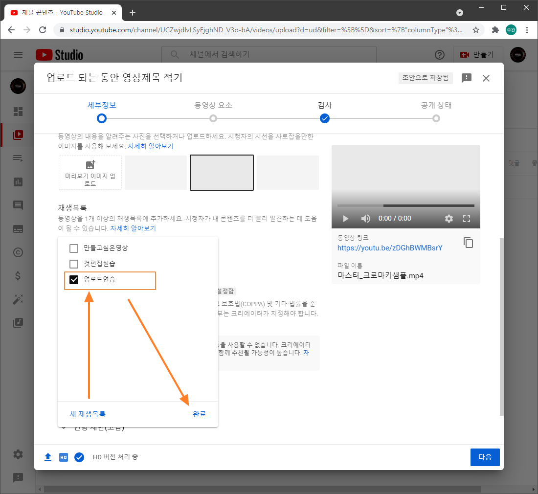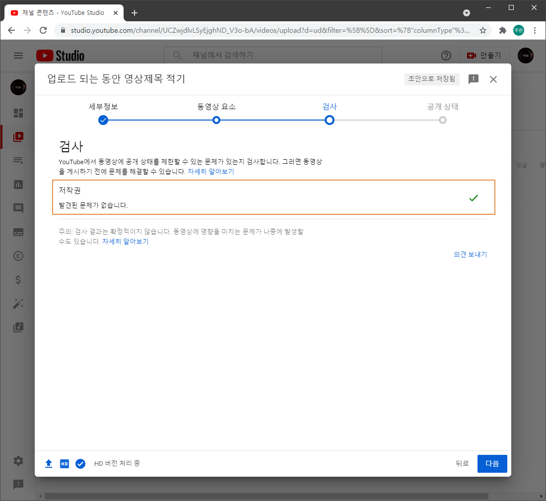 업로드가 끝난 후 'HD 버전 처리 중' 이라고 나오면 [ 다음 ] 버튼을 누릅니다.