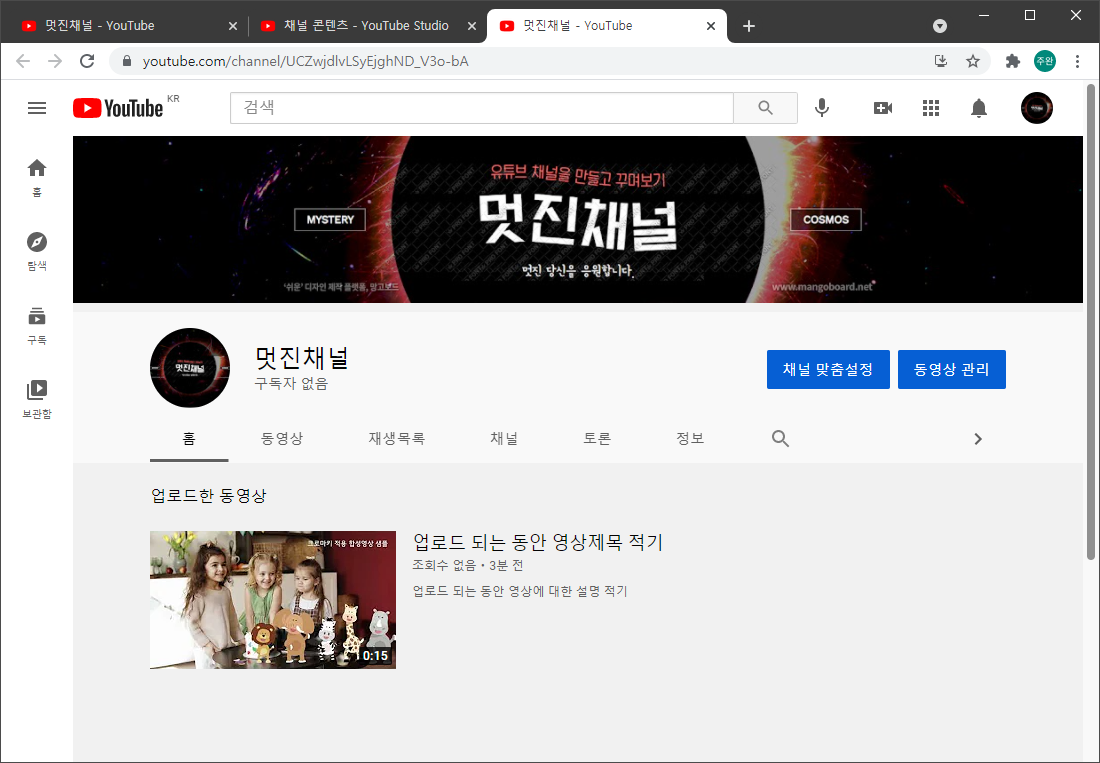 뒤에 만들어진 탭을 다 닫고 나니 첫 페이지가 보입니다. 그런데 업로드한 영상이 안 보이네요!
