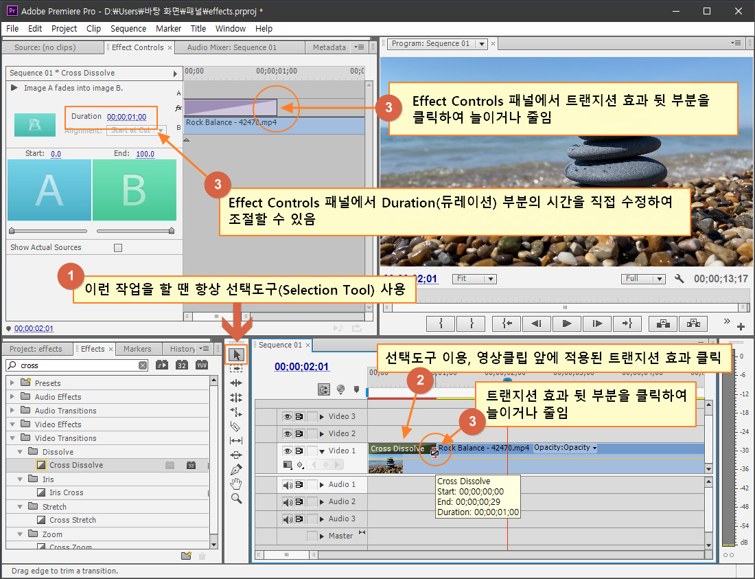 - 트랜지션 효과 부분을 직접 클릭하여 길이 조절
